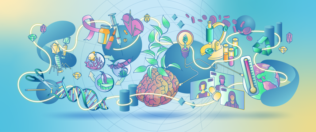 An illustration of a pencil, scissors, a DNA molecule, a fish, a bird, a penguin, medical supplies, a heart, a brain, leaves, a light bulb, a microscope, laboratory testing tubes, three screens depicting people in a virtual meeting, a thermometer, planet Earth and a recycling sign in front of a blue and yellow background.